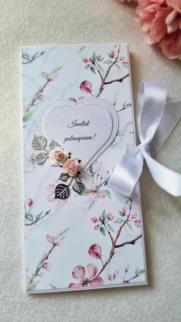Kauni disainpaberiga kaunistatud rahakaart pulmadeks. Valikus on 3 erinevat disaini. Käsitöökaarte kaunistavad erinevad detailid ja kaunistused.