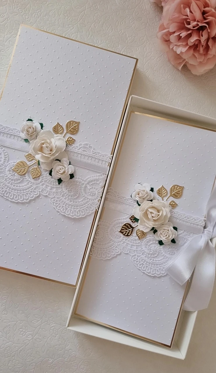 Rahakaart ja karp on kaunistatud nude´ tooni metallikläikega kartongist ja rose gold peegelkartongist. Käsitöökaarti kaunistab pits, lilled, õielehed ja elevandiluu valge pael, millega saab kaardile ilusa lipsu siduda.