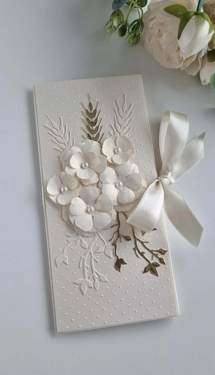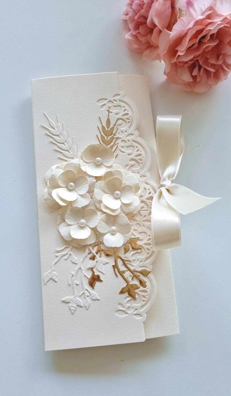 Luksuslik käsitööna valminud rahakaart, mis sobib väga hästi pulmadeks kinkida. Kaart avaneb kolmeks osaks ja kaardi sees on piisavalt ruumi teksti kirjutamiseks.Käsitöökaarti kaunistavad valged/helekuldsed pärlmutter läikega käsitöölilled, peegelhõbedased/peegelkuldsed ja valged/helekuldsed oksakesed ja viljapead. Täpsemaid disaine vaata galeriist. Lumivalgest/elevandiluuvalgest või heleroosast atlaspaelast saab pulmakaardile siduda kauni lipsu. Vaata täpset kaardi värvide kooslust pildigaleriist.