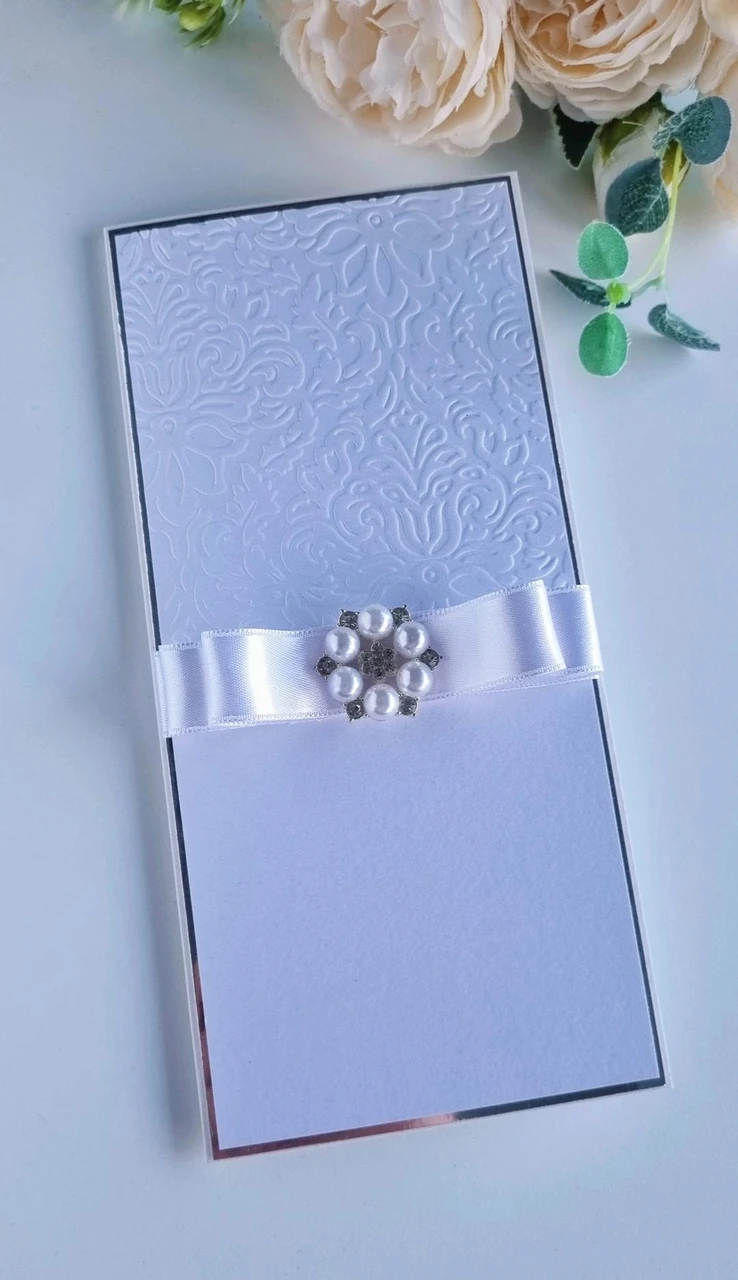 6. Valge käsitöökaart peegelhõbedase raami, valge lipsu ja pärlitega prossiga.