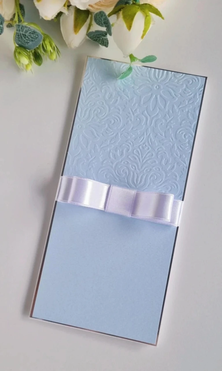 Kaart avaneb kolmeks osaks, kus on piisavalt ruumi teksti kirjutamiseks või meie poolt prinditud õnnesoovide lisamiseks.Kaarti kaunistab elevandiluuvalgest, roosast või valgest paelast elegantne lips.
